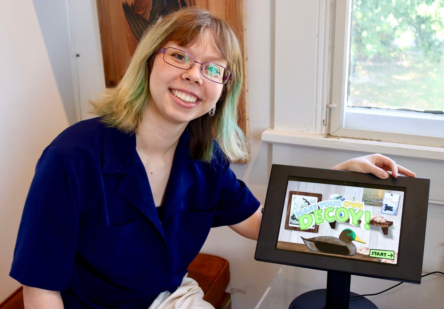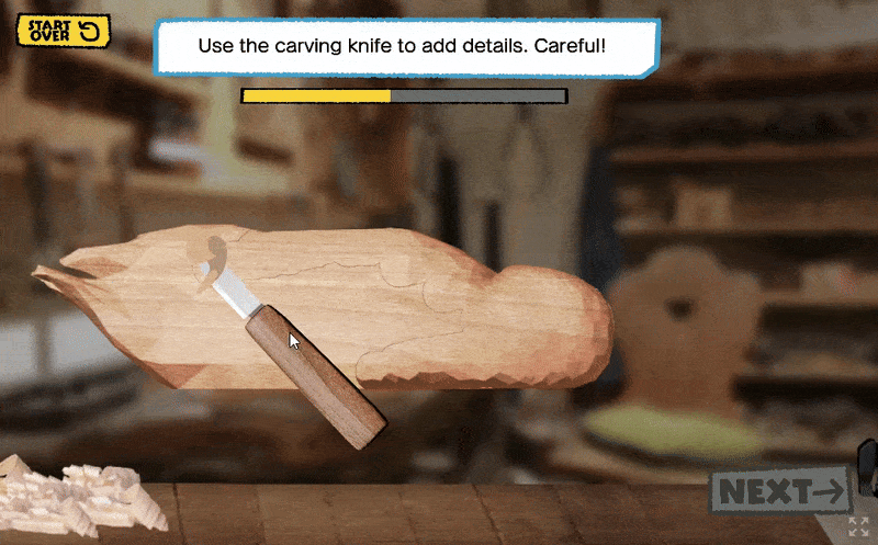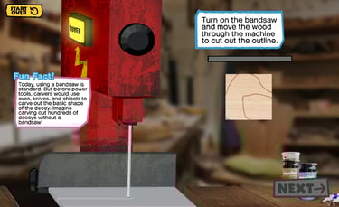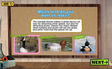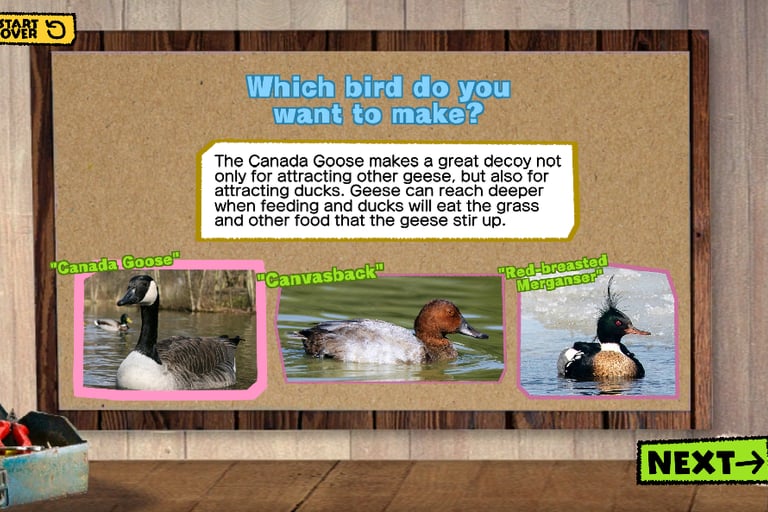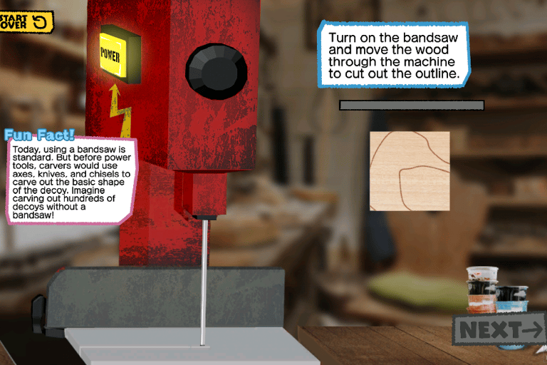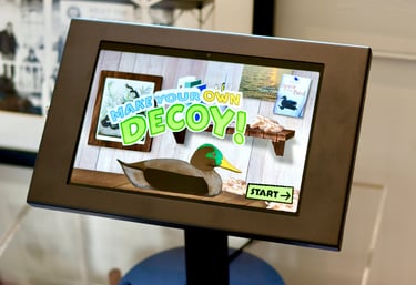 This project was created for the Barrier Islands Center (BIC), a museum and cultural center in Machipongo, VA. While interning at the BIC, I was asked to find new ways to engage the tween and teen demographics. My solution was an interactive digital display that takes visitors through the process of decoy carving, blending the technical and historical sides of American folk art. As a self-taught programmer at the time, I challenged myself to learn a new game engine and scripting language while also collaborating with local artisans, museum educators, and BIC members to ensure the experience was both engaging and educational.